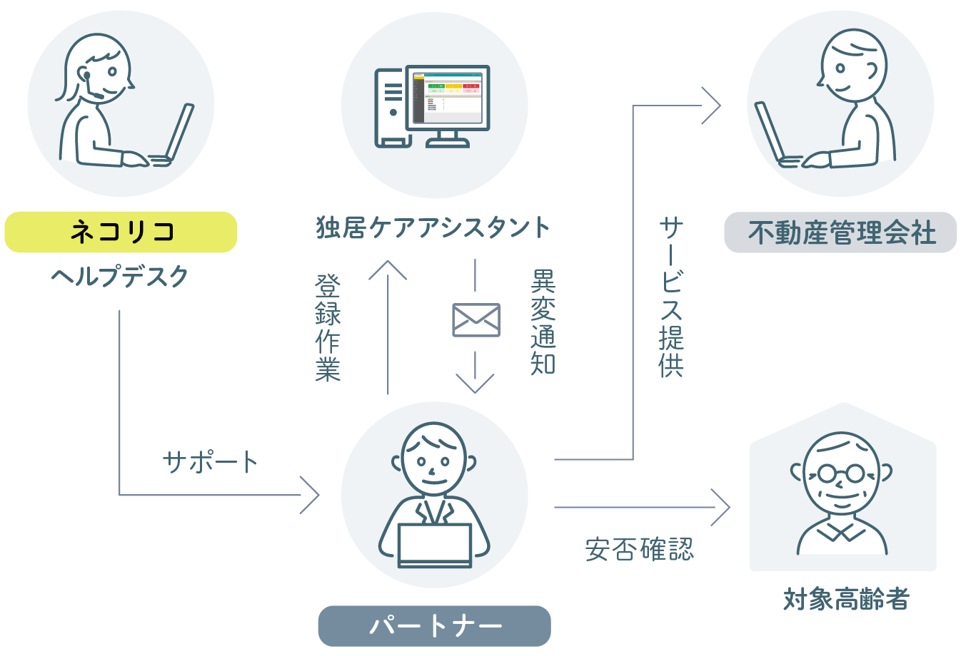 法人様はWEB上で利用規約に同意の上、サービス申し込みを行います。見守りサービスの提供主体は法人様となり、利用者(見守られる方)へのサービス提供および利用料のご請求は、法人様にて実施いただきます。弊社は、独居ケアアシスタントの提供(管理パネル、センサー)を行い、毎月のご利用料金およびセンサー費用をご請求(お支払はクレジットカードもしくは銀行振込)します。法人様は他のサービスと組み合わせてご利用いただくことで、さらに充実したサービス提供が可能となります。