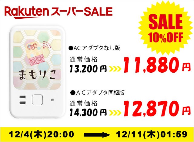 ニュース まもりこお知らせ 【期間限定】楽天スーパーセールで「まもりこ」が10%OFF!年末年始の見守り準備に 2025.12.04 年末年始の帰省のタイミングで、離れて暮らすご家族の見守りをはじめませんか? 冷蔵庫の開閉からご家族の様子を見守れる「まもりこ」なら、Wi-Fi不要・コンセントに挿すだけで簡単に始められます。 12月4日(木)20時からはじまる楽天スーパーセール(株式会社ホスピタルサービス様運営)では、期間限定で 「まもりこ」が10%OFF でご購入いただけます! この機会に、年末年始のご実家訪問に合わせて設置してみてはいかがでしょうか。 ご家族の安心を、年末年始からスタートしましょう。 開催期間 12月4日(木)20:00~12月11日(木)01:59 特別価格 通常価格より10%OFF ■ACアダプタ同梱版:14,300円→12,870円(1,430円割引) ■通常版:13,200円→11,880円(1,320円割引) ホスピマート介護店 https://item.rakuten.co.jp/kaigo-hps/07316/ 一覧に戻る Tweet シェア お問い合わせ 個人のお客さま サービスや製品のご質問 法人のお客さま 販売・取扱い・OEM等ビジネス全般のご相談 個人のお問い合わせ フォームでお問い合わせ 電話でお問い合わせ TEL 03-5205-4468平日9:00~17:00