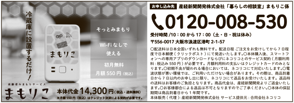 ニュース まもりこお知らせ 高齢者みまもりサービス「まもりこ」|お電話でご購入いただけるようになりました。 2025.12.09 このたび、高齢者みまもりサービス「まもりこ」が、産経新聞開発様が運営する「暮らしの相談室」にて販売開始となりました。 「暮らしの相談室」では、「まもりこ(ACアダプタ同梱版)」をお電話にてご注文いただけるほか、本体代金を銀行振込でお支払いいただくことも可能です。 (月額利用料のお支払いについては、従来どおりクレジットカードのみとなります。) お電話でのご購入をご希望の方は、ぜひ「暮らしの相談室」まもりこ係までお問い合わせ・お申し込みください。 一覧に戻る Tweet シェア お問い合わせ 個人のお客さま サービスや製品のご質問 法人のお客さま 販売・取扱い・OEM等ビジネス全般のご相談 個人のお問い合わせ フォームでお問い合わせ 電話でお問い合わせ TEL 03-5205-4468平日9:00~17:00