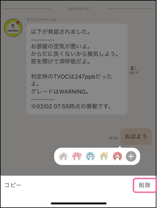 サポートトップ よくあるご質問 マニュアル お知らせ お問い合わせ 製品紹介 マニュアル メッセージを削除する 自分が送信したメッセージとBOCCO emoから送られてきたメッセージは、アプリ上でメッセージ部分を長押しし、削除が可能です。削除されたメッセージは、他のメンバーのチャットルームからも表示が消え、BOCCO emo本体でも再生することができなくなります。他のメンバーが送信したメッセージは削除することができません。 アプリについて 戻る サポートトップ よくあるご質問 マニュアル お知らせ お問い合わせ 製品紹介 お問い合わせ 製品紹介 サポートに関するお問い合わせ